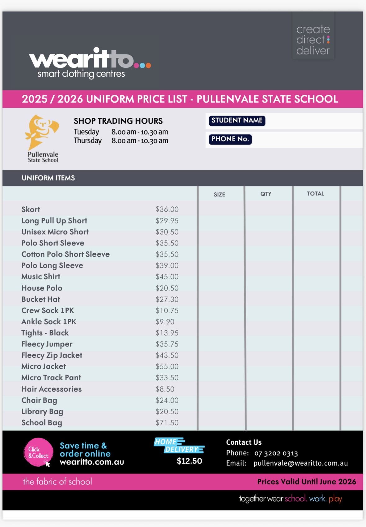 Please refer to the Price List and Order Form (JPG, 295KB) and Uniform Policy (PDF, 238KB).